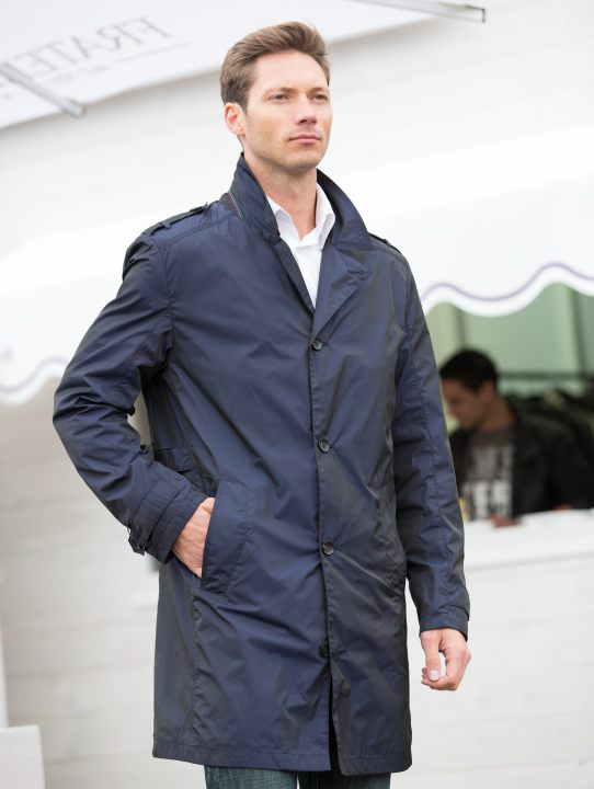 Силуэт приталенный, застежка на пуговицы, 2 наружных и 3 внутренних кармана, сзади — шлица. Плащ хорошо сидит на фигуре, закрывает пиджак. Водоотталкивающая несминаемая ткань с отливом. Стиль - classico.