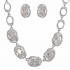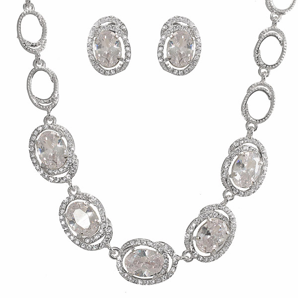 Блестящий комплект — колье в форме крупной цепочки, симметрично декорированное цирконием, и серьги овальной формы. Вставки: стразы Swarovski, циркон. Гальваническое покрытие: родий.