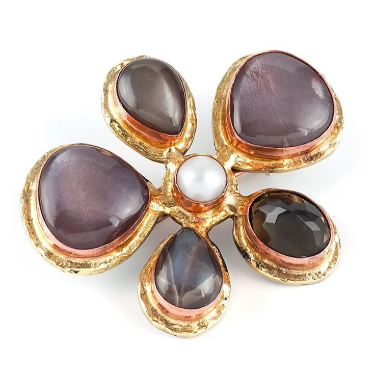 Состав: Персиковый лунный камень, искусственный жемчуг, раухтопаз, медь, латунь, высоколегированная сталь