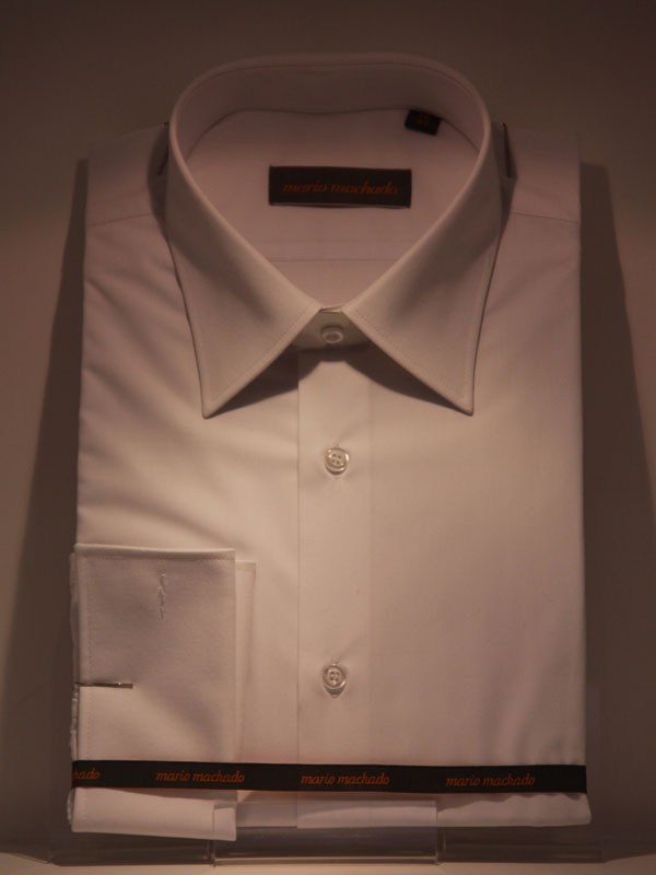 Приталенная по бокам сорочка с двумя защипами на спине и срезанным воротничком. Французские манжеты для ношения запонок.