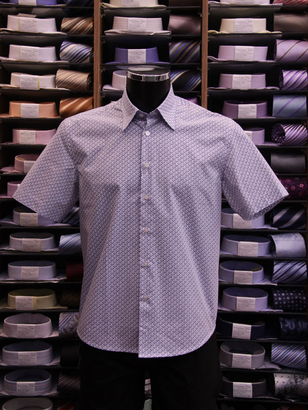 Натуральная сорочка с короткими рукавами на кокетке, без защипов. Сине-голубой рисунок в виде мелких колец настраивает на отдых. Воротник изнутри отделан светло-голубой тканью, а его края фиксируются к основанию рубашки потайными пуговицами. Низ модели закруглен.