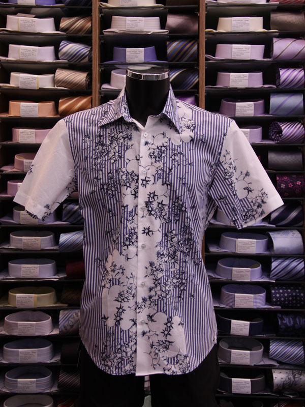 Летняя сорочка с коротким рукавом, с двумя защипами по бокам. Абстрактный рисунок сочетает голубые полосы и синие цветы. Модель заужена, имеет закругленный низ.