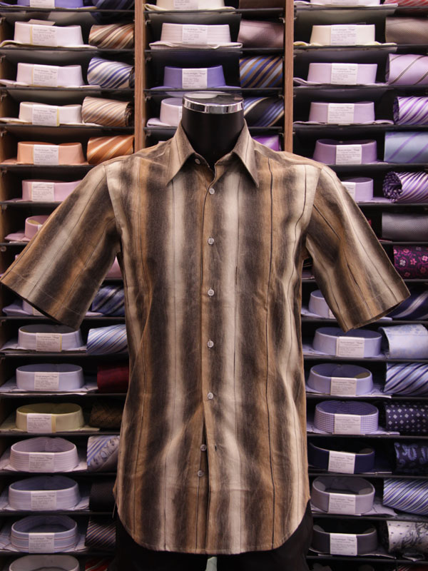 Зауженная сорочка с вертикальными широкими полосами серого, горчичного и бежевого цветов. Рукава короткие, низ закруглен. Рекомендуется для носки с брюками любой модели и джинсами.