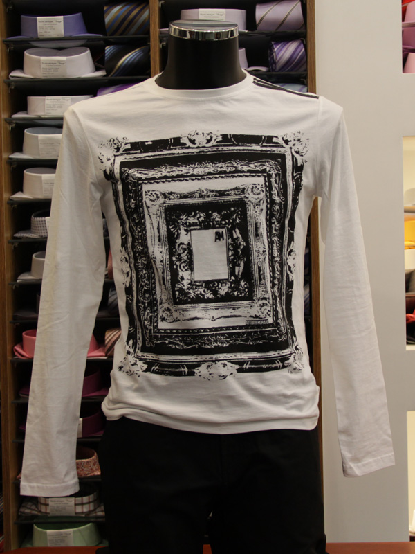 Белая футболка с черным рисунком на груди, рукава длинные, прямой силуэт. Левое плечо декорировано двумя черными полосками, сзади на спине фирменный логотип.
