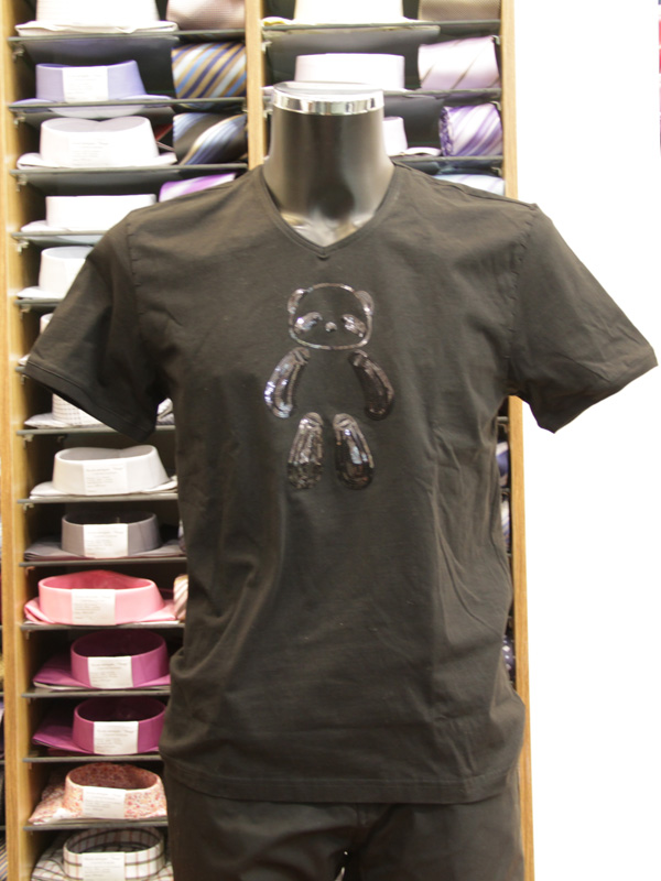 Футболка с коротким рукавом, края которых обрамляет узкая эластичная вставка. Неглубокий V-образный также отделан эластичной тканью. Акцентом данной модели является медвежонок, выполненный из мелких блестящих копеек черного цвета.