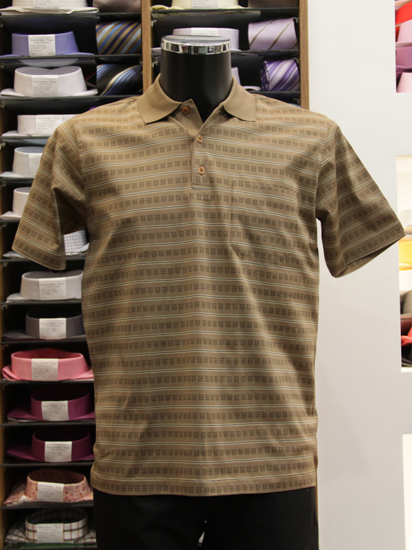 Классическая модель с короткими рукавами в тонкую горизонтальный полоску с мелким рисунком предназначена для носки с брюками и джинсами любых моделей. Воротник трикотажный, 3 пуговицы. На левой части груди отрезной карман.