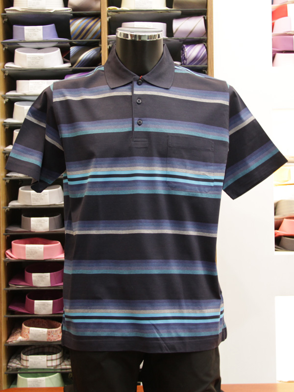 Тенниска насыщенных цветов в горизонтальную серо-голубую полоску идеально подходит для носки с любым видом джинсов и шорт. Трикотажный воротник, 3 пуговицы. На левой части груди накладной карман.